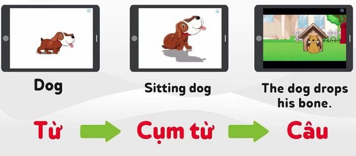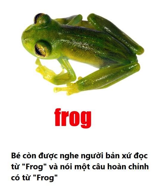 Ví dụ như từ Frog (con ếch), bé sẽ được nhìn Hình con ếch, tiếng kêu con ếch, nhìn ếch nhảy, cùng mẫu câu mô tả kèm theo. Việc học tiếng anh trực tiếp qua hình ảnh, chính xác là cách mà 1 bé bản xứ ở Mỹ học, và giúp bé xây dựng tư duy tiếng Anh trực diện ngay từ nhỏ (giúp bé học tiếng anh trực tiếp, mà không qua ngôn ngữ trung gian như tiếng Việt). Việc học trực diện, mô tả sinh động, thú vị, sẽ giúp bé học tiếng anh hiệu quả, và vận dụng tiếng anh nhanh hơn (không cần dịch sang tiếng Việt như cách học truyền thống).