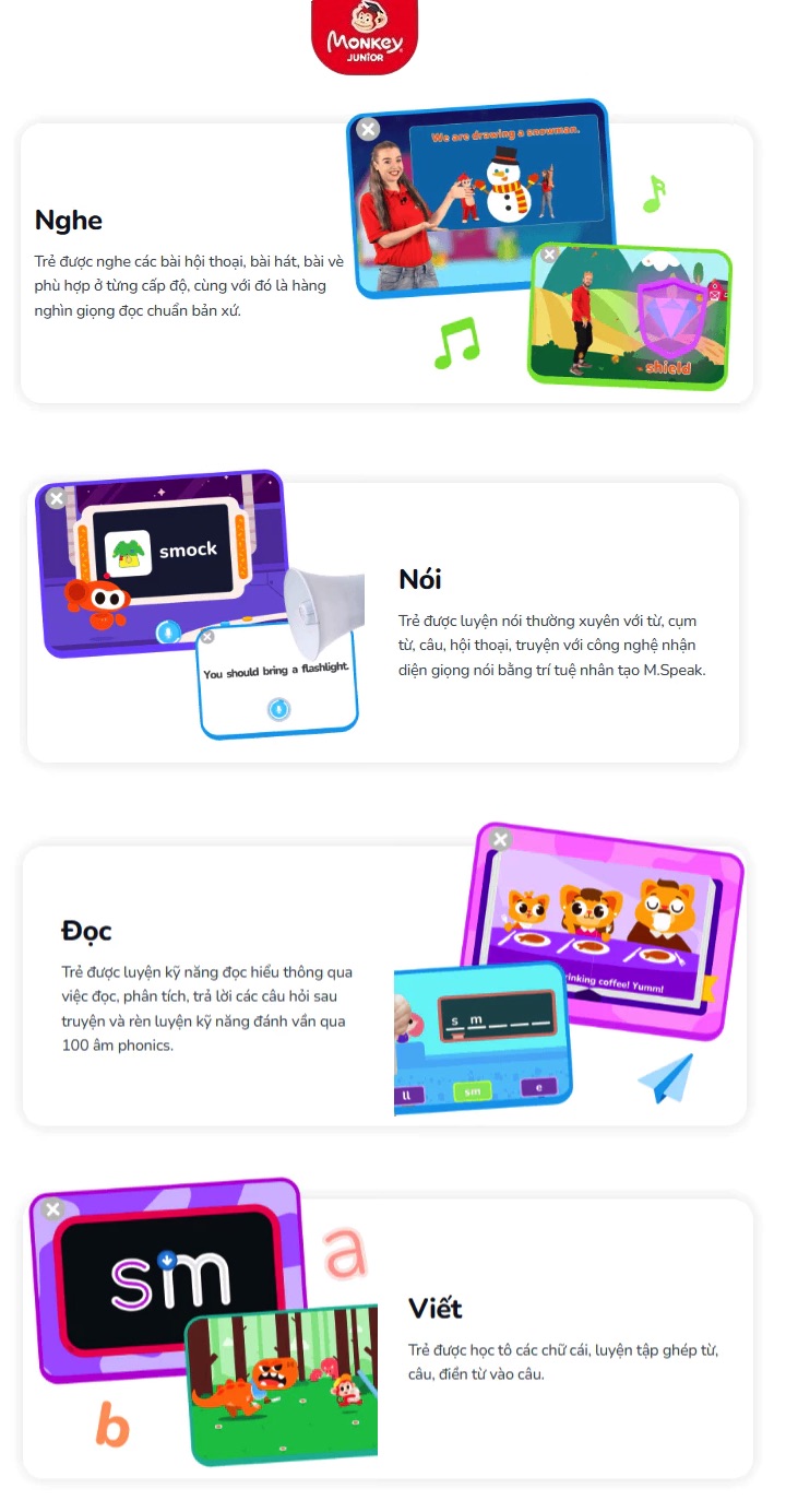 Phiên bản mới nhất, đã mở rộng sang kỹ năng đọc – viết – tương tác thực tế. Nên hiện tại, Monkey Junior mới nhất đã có thể giúp bé hoàn thiện 4 kỹ năng nghe – nói – đọc – viết. |