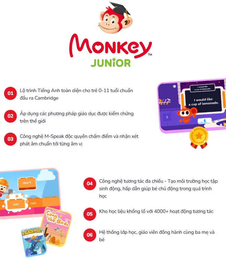 Monkey Junior cũng được xây dựng lộ trình học tiếng anh một cách bài bản dựa trên nhiều phương pháp giáo dục sớm, đạt chuẩn Cambridge (Mỹ), và còn xây dựng theo hệ thống tiêu chuẩn Common Core State Standards (CCSS) của Hoa Kỳ – tiêu chuẩn giảng dạy cao nhất dành cho trẻ em bậc Mầm non và Tiểu học tại Mỹ và nhiều quốc gia phát triển. Monkey Junior dành cho các bé từ 0 – 10 tuổi có thể học được (phiên bản mới nhất thì xây dựng thêm, để bé từ 0-11 tuổi, học ngôn ngữ hiệu quả). Đặc biệt, Monkey Junior còn ứng dụng 7 phương pháp học ngôn ngữ hiệu quả khác như: